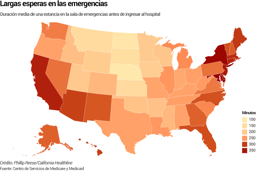 Además, los tiempos de espera también aumentaron durante ese período: en 2017, el tiempo promedio fue de 336 minutos, o más de 5 horas y media. Un aumento de 15 minutos desde 2012, según datos de los Centros de Servicios de Medicare y Medicaid (CMS).