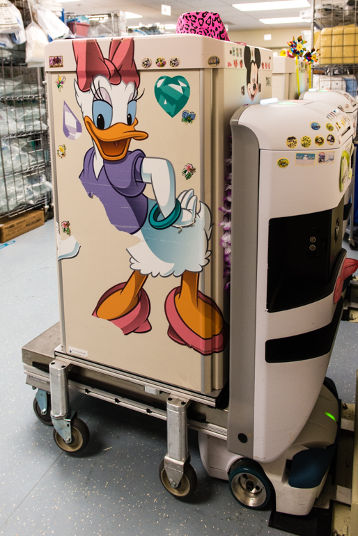 The Tugs are kind of cute, but also a little unnerving, as they shuttle past other hospital workers like they own the joint. Each one is carefully programmed to stay out of the way, said Henroid, but sometimes it feels as if one could mow down a bystander.