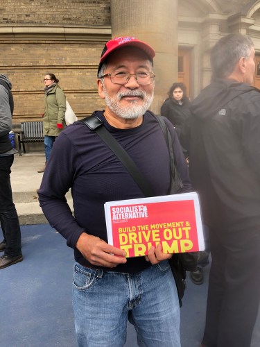 James Sugiyama, a Toronto-based doctor, watched Sanders’ speech on a livestream from a restaurant down the street. The Vermont senator is viewed as a “folk hero” by many Canadians, he said. (Shefali Luthra/KHN)