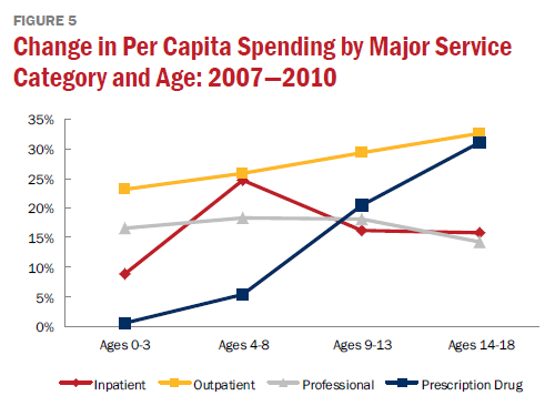 Authors of the latest report note several areas for concern in addition to price increases. Children’s use of mental health and substance abuse services jumped nearly 24 percent. Prescriptions for antidepressants and similar psychiatric drugs rose more than 10 percent, and in 2010, children age 14 to 18 each had at least one prescription, on average.