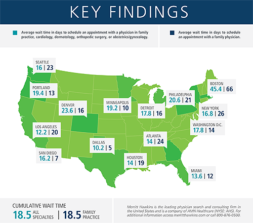A in 15 metropolitan areas across the country, which was聽taken before the health law expanded coverage, found that the average wait time for a new patient to see a physician in five medical specialties was 18.5 days. 聽The longest waits were in , where an average of 72 days to see a dermatologist and 66 days to see a family doctor. The shortest were in Dallas, where the average wait time is 10.2 days for all specialties, and just 5 days to see a family doctor.